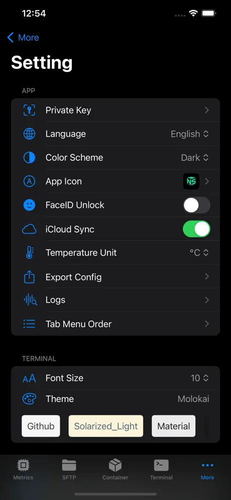 Security, featuring support for password and biometric (FaceID, TouchID) unlocking mechanisms.